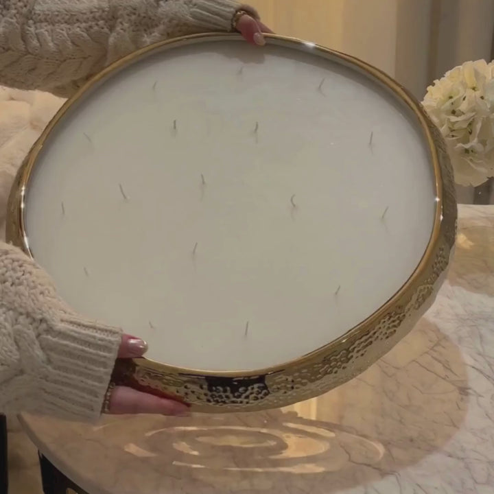 With its impressive size in a glam gold finish and 17 flickering wicks, this candle demands attention in any room.