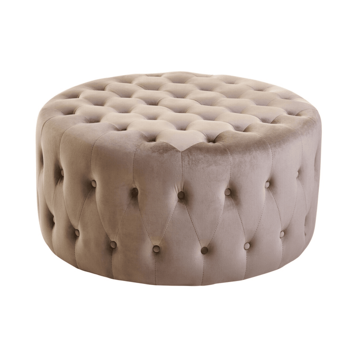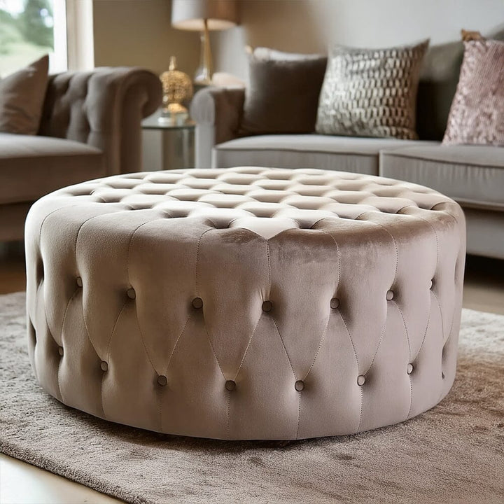 The Cetona Taupe Velvet Buttoned Round Footstool is a stylish and versatile piece for your living space.